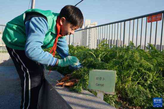 11月24日,进华中学学生在“屋顶生态园”里收获胡萝卜。