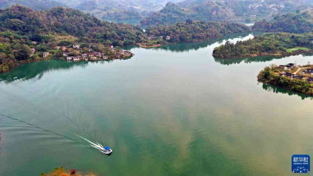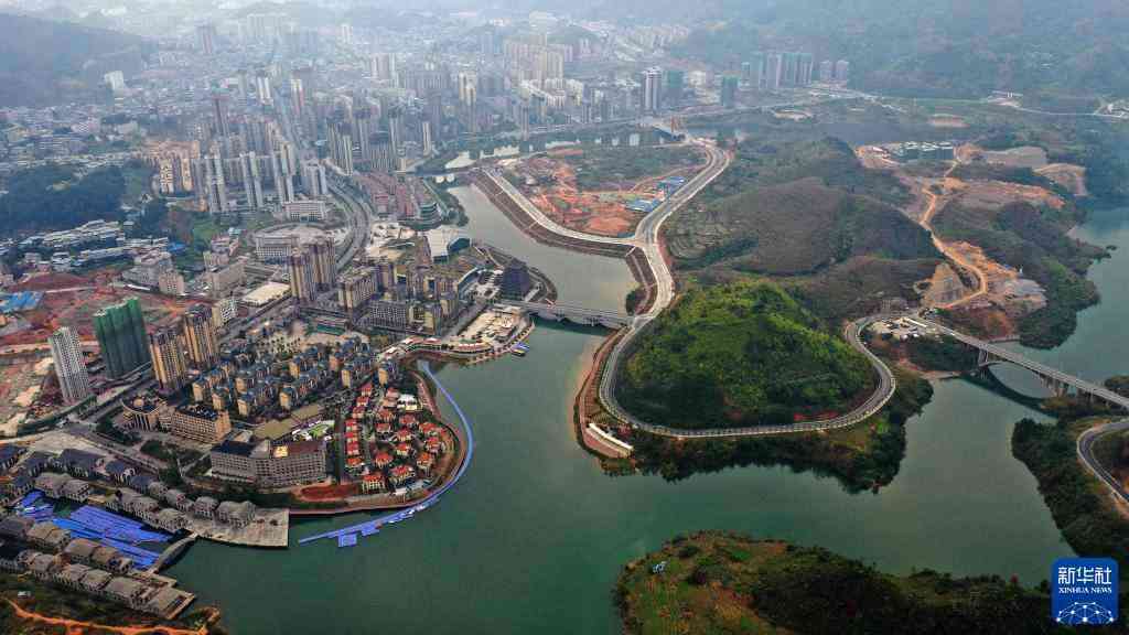 冬日,贵州省黔南布依族苗族自治州罗甸县城东新区坝王河、民居、桥梁等交相辉映,美如画卷。