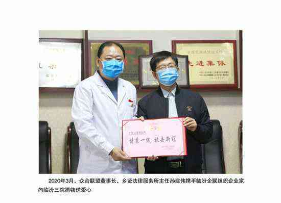 疫情期间,孙建伟代表“众合联盟”向临汾第三人民医院进行爱心捐赠,并积极参加公益组织帮扶困难群众;闲暇之余,他做客“临汾交通文艺广播电台”,为老百姓解疑答惑,普基法律知识;开学季前夕,他倾情资助贫困大学生……他说,这是他对社会应尽的责任。“再苦再难,我觉得所做的这一切都值得,都有意义。”孙建伟说,“习近平总书记在今年7月21日主持召开的企业家座谈会上指出,任何企业存在于社会之中,都是社会的企业。社会是企业家施展才华的舞台。只有真诚回报社会、履行社会责任的企业家,才能真正得到社会认可,才是符合时代要求的企业家。”听了总书记的讲话,孙建伟醍醐灌顶,也更加坚定了他把这项事业做强、做大的决心。