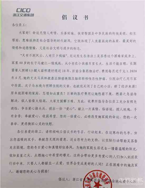 吴阿姨是余姚收费中心所牟山站的一名清洁工,自杭甬高速公路通车便在所里工作,已有20多年。最近,吴阿姨总是愁眉不展,一直做得利索的工作也频频出现疏忽。通过与吴阿姨谈心,了解到她在生活中遇到了困难。吴阿姨有两个儿子,长子幼年便是一级残疾,从小生活无法自理;次子经营一家小店,解决一家生计问题。2020年6月,原本拮据的家庭陷入了困境——吴阿姨的丈夫得了肺癌。为了照顾父亲,次子关了小店,一家人仅靠吴阿姨的收入过日子,巨额的医疗费用拖垮了这个拮据的家庭。