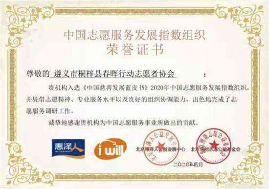 2021年“中国百家志愿服务发展指数组织”从全国遴选确定了104家志愿者组织,其中贵州有2家志愿者组织入选。桐梓县春晖行动志愿者协会从2019年加入指数组织,已连续两年参与问卷调查,协助课题组以专业志愿精神探索和促进志愿服务基础研究,共同推动中国志愿服务事业专业化健康发展。