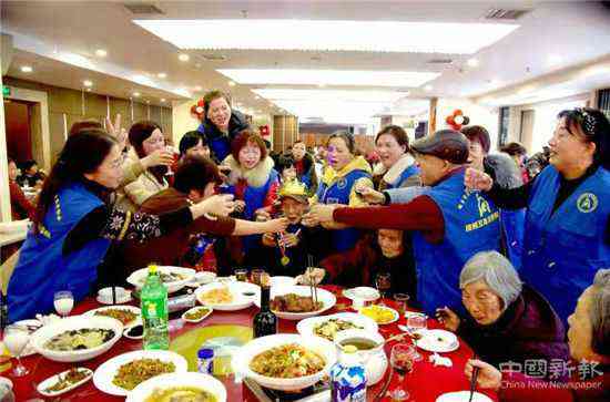 志愿者与老兵吴移和爷爷一起品尝寿宴