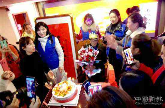 吃完饭后,伴随着《生日快乐》的歌曲,志愿者为吴移和爷爷切蛋糕,吴爷爷脸上笑开了花。