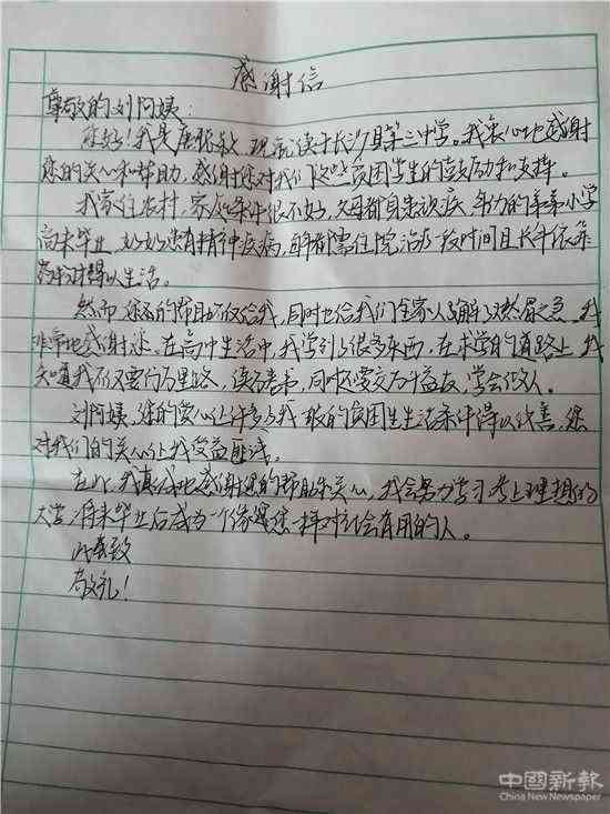 当义工们离开唐家时,唐同学请大家帮她把写给爱心人士刘女士的一封感谢信转交给刘阿姨以示感谢。据悉;已经连续一对一帮助聪颖第四个年头的刘女士拒绝了记者的电话采访,她反复说自己只想默默地做一点点小事。