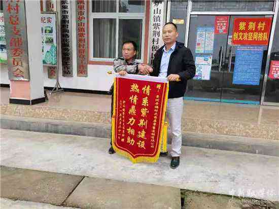 捐赠结束后,紫荆村支书向贵州幸福村连锁药房的负责人欧镇远赠送锦旗,表达谢意。“我们一定不忘初心,牢记使命,坚持践行全心全意为人民服务的根本宗旨,带领全村人民创造更加幸福美好的生活。”凯里市紫荆村的村支书说。