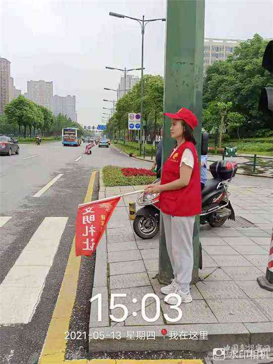 5月22日,迎来了一群内穿蓝色校服外套红色志愿者马甲的中学生志愿者,他们都是来自长沙县天华中学2002班的青少年志愿者。天空中下着毛毛细雨,同学们在家长的带领下一起来到开元路天华路口进行文明交通安全劝导。
