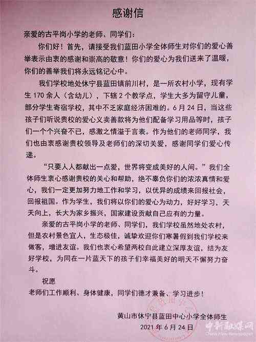 “‘只要人人都献出一点爱,世界将变成美好的人间’我们全体师生衷心感谢南京古平岗小学师生的关心和帮助,绝不辜负你们的浓浓真情和爱心,我们一定更加努力地工作和学习,以优异的成绩来回报社会,回报祖国。作为学生,我们将以你们的爱心为动力,好好学习,天天向上,长大为家乡振兴,国家建设贡献自己应有的力量。也衷心希望两校自此建立深厚友谊,结为友好学校,为同在一片蓝天下的孩子们幸福美好的明天不懈努力奋斗。”该校在给南京古平岗小学的感谢信中写道。(王秀娟 程亮)