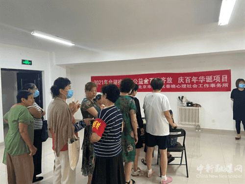 在党百年华诞喜庆之际,6月30日上午,北京市通州区台湖镇拾景园社区与北京市通州区春晓心理社会工作事务所共同在社区开展了公益志愿服务,庆祝建党百年,让居民感受党的关怀。