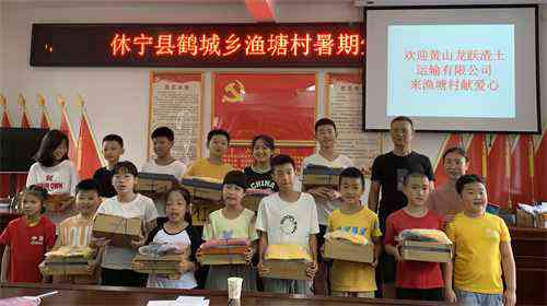 7月28日,来自黄山市龙跃渣土运输有限公司的工作人员来到了鹤城乡,为渔塘村暑期爱心课堂的40余名留守儿童献上了来自企业的关爱。兴奋的小朋友们当场换上了企业赠送的五颜六色的T恤、运动裤、运动鞋,着装焕然一新的孩子们喜不自禁,现场摆出各样的造型拍起照片,别提多高兴了。