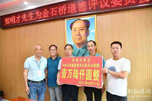 “我虽然在深圳创业,但我经常关注家乡的发展,了解到道德评议委员会为弘扬社会正气无私奉献,我今天尽点微薄之力。”8月17日,广东省深圳市鸿发机械有限公司董事长郑明才,在湖南省隆回县金石桥镇给该镇道德评议委员会捐助资金16000元如是说。