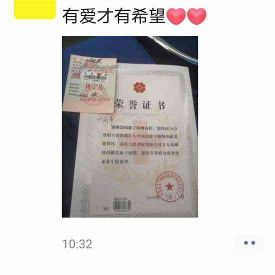 “感谢您捐献了检测血样,您的HLA分型相关资料将汇入中国造血干细胞捐献者资料库。请在与患者配型相合时义无反顾地捐献造血干细胞,您的善举将为患者带来重生的希望。”叶丽萍将拿到的这份荣誉证书拍成图片发往朋友圈,呼吁身边的每个人都积极主动、自觉自愿的参与“义务献血、奉献爱心”。(黄旭雯 荚浩 盛红兵)