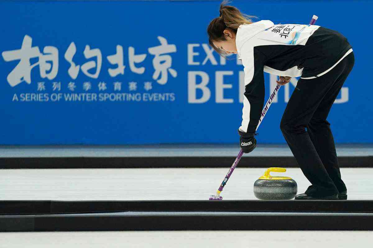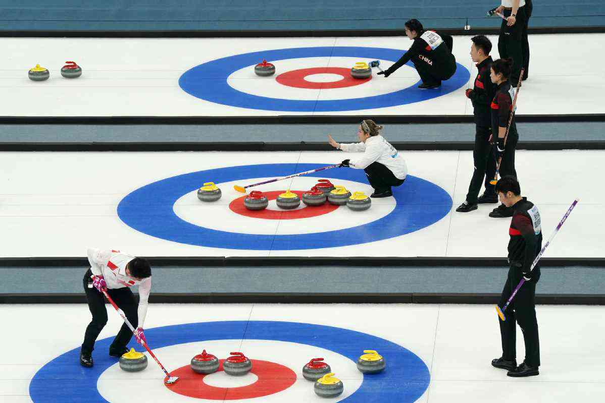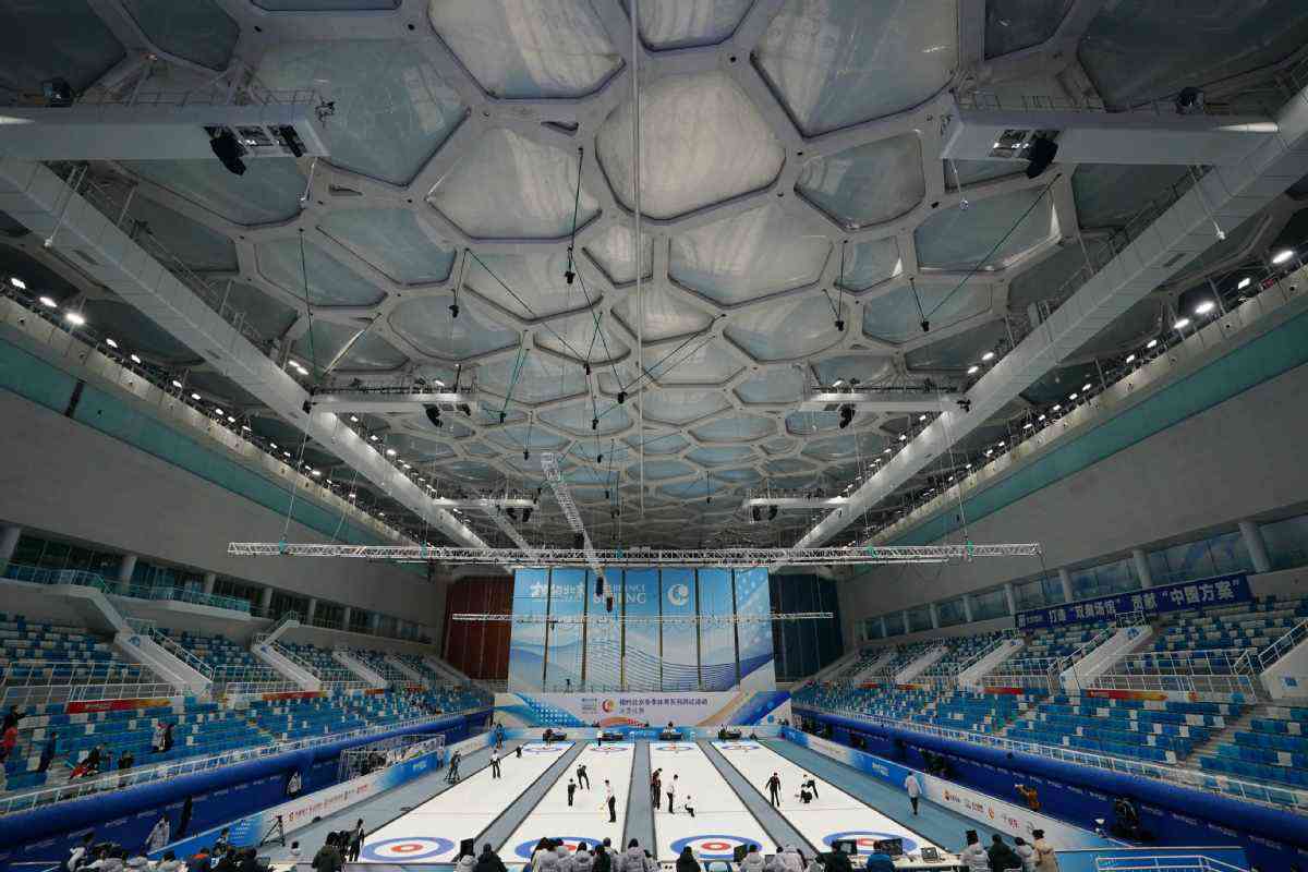 4月1日,北京国家游泳中心,运动员参加“相约北京”冰壶测试活动。(中国日报记者 魏晓昊 摄)