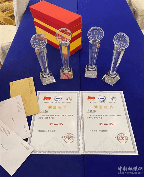 图为严康恺及团队荣获湖南省“九星杯”围棋锦标赛的证书及奖杯