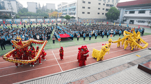 开幕式上,在国旗队、鲜花队、彩旗队、舞龙舞狮队的引导下,43个班级组成的方阵身着整齐的服装,迈着矫健的步伐,高喊口号,精神抖擞地步入运动场。在主席台前,各班级同学或手拿鲜花、气球变换队形,或高举横幅、旗帜口号嘹亮,或表演武术、舞蹈朝气蓬勃,或头戴面具、手舞道具滑稽有趣……充分凸显了班级的精神面貌及文化特色。校舞龙舞狮队的精彩表演更是将该校运动会入场式活动推向了高潮。
