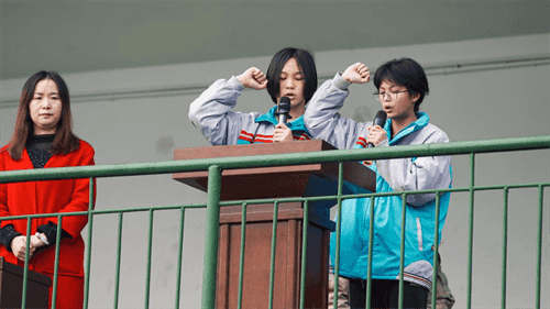 接着裁判员代表张帆老师、运动员代表唐欣蕾、陈希先后进行庄重宣誓,他们均表示将以公平友好的态度参加本届运动会,弘扬奥林匹克精神,充分展示全校师生积极向上的风貌。体育组组长谭纯正老师宣布竞赛日程后,各班学生依次有序退场。