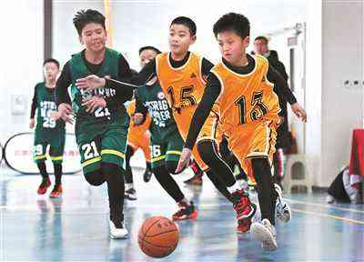 昨日,2021年北京市第一届小学生篮球比赛在天通苑体育馆开赛。本次比赛设有男子组和女子组,每组12支队伍参赛。图为怀柔区第三小学选手席浩然(右一)在比赛中进攻供图/新华社