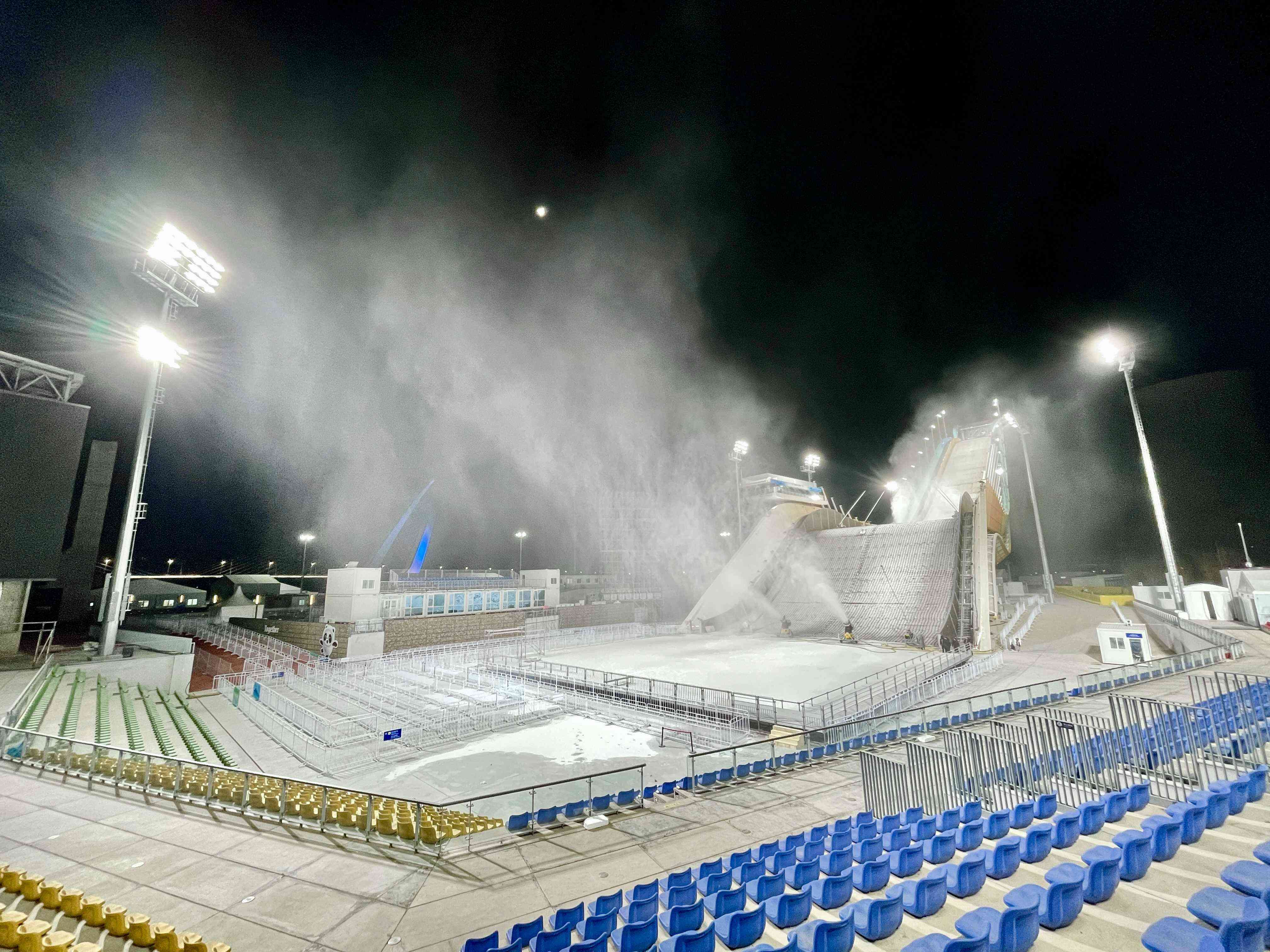 记者在现场看到,结束区摆放着两枪一炮,起跳区则是两炮四枪,同时留有一枪一炮备用。首钢滑雪大跳台通过分区搭配使用造雪设备,以满足不同区域对于雪量要求。“我们的造雪工作是在结束区与起跳区同步开始,并逐步向出发区推进。其中出发区雪厚将达0.5米,跳台赛道和结束区为0.5米到4米。”首钢滑雪大跳台场馆运行团队后勤副主任金洪利告诉记者。