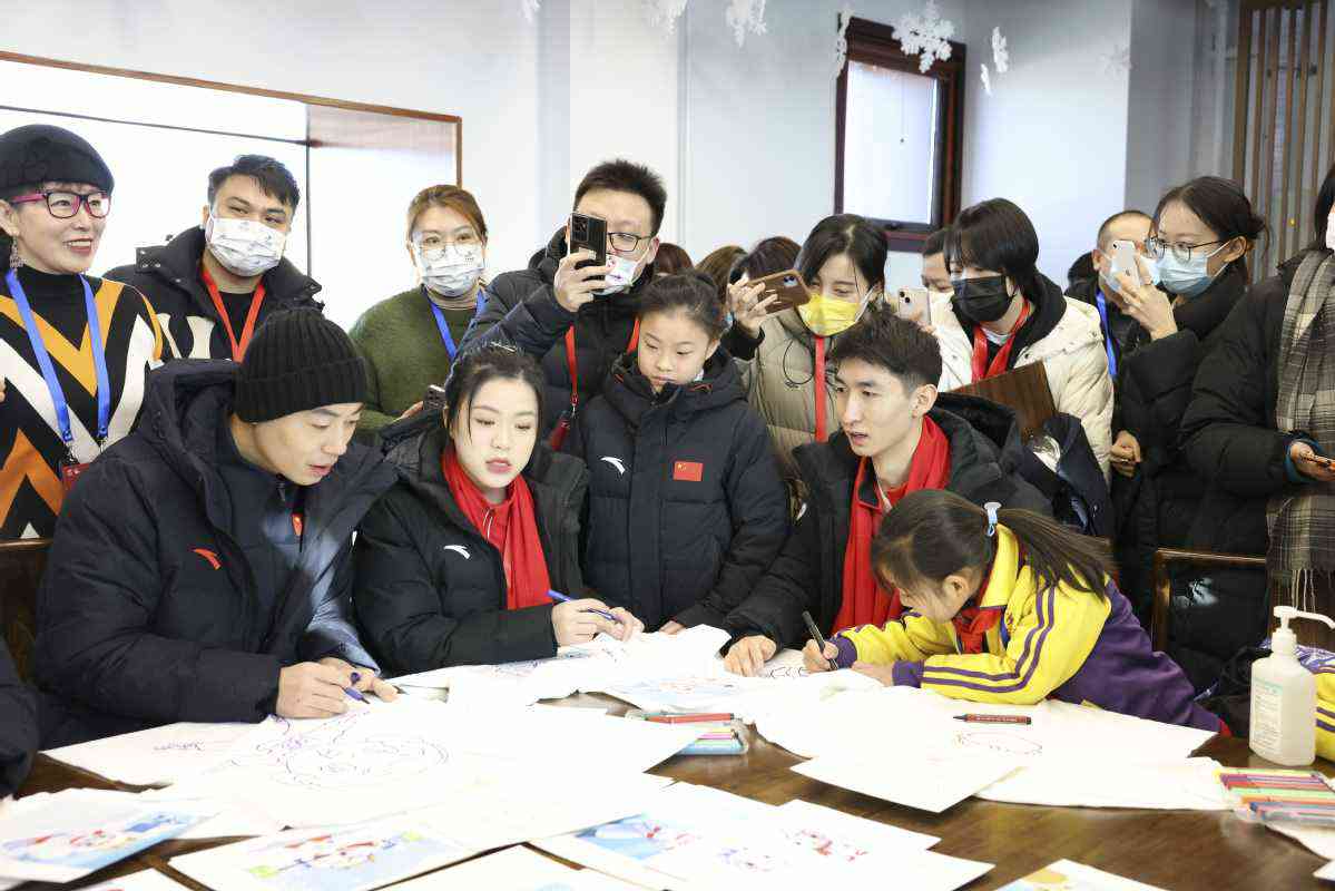 演员朱亚文、东京奥运会射击冠军杨倩、东京奥运会平衡木冠军管晨辰、短道速滑运动员武大靖(前排从左到右)参加“百城千校‘画冬奥 滑冰雪 话健康’”互动体验 (摄影:冯永斌)