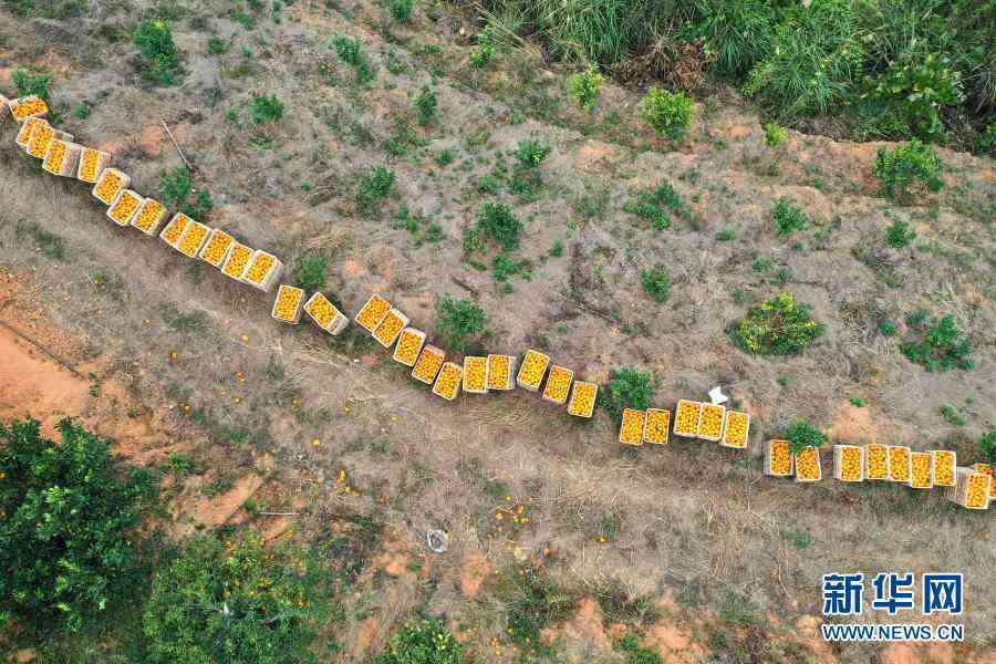 在上思县那琴乡排柳村红香橙种植基地,刚采摘的红香橙摆在路边等待装运(1月26日摄,无人机照片)。