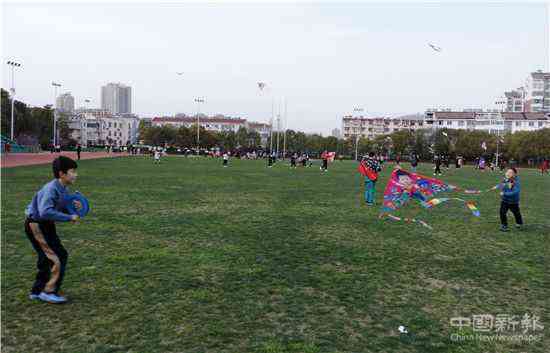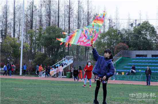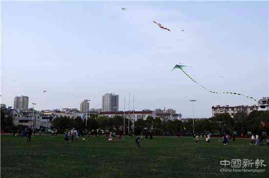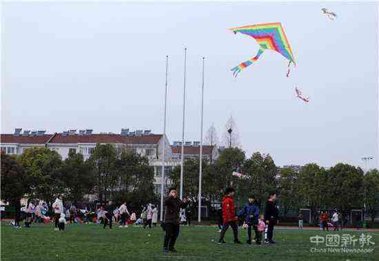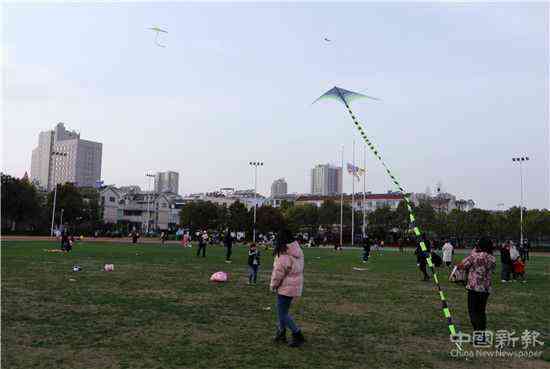2021年3月21日周日晴好,春意浓浓,安徽省合肥市庐江县全面健身活动中心,很多年轻家长在带着孩子在放飞风筝。