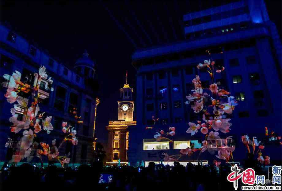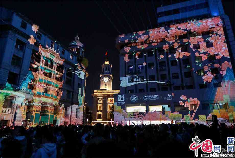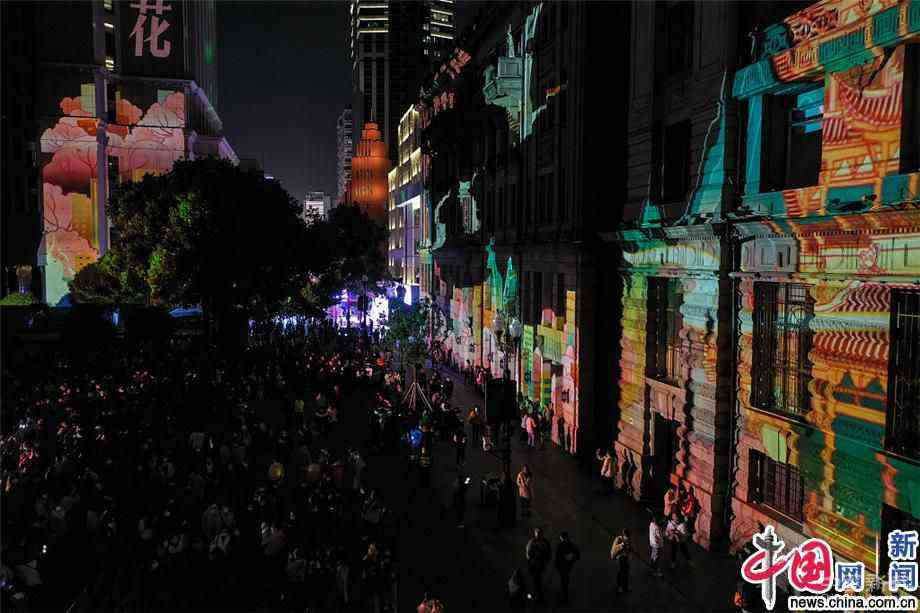 2021年3月22日,湖北武汉江汉路步行街上演樱花主题灯光秀,通过灯光方式创意呈现“满城樱花”的浪漫场景,促进夜间文化休闲消费。赵军/视觉中国