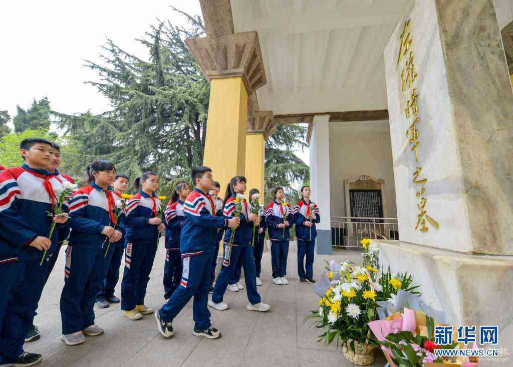 4月1日,邯郸市邯山区农林路小学学生在晋冀鲁豫烈士陵园向左权将军墓献花。新华社记者 王晓 摄