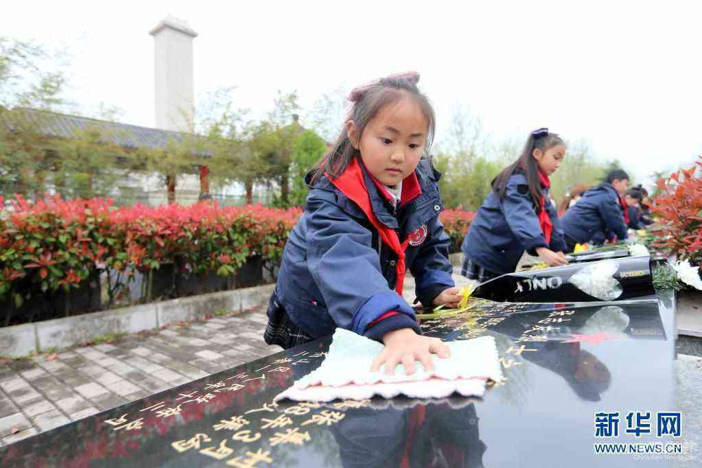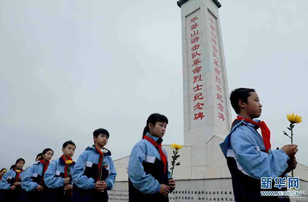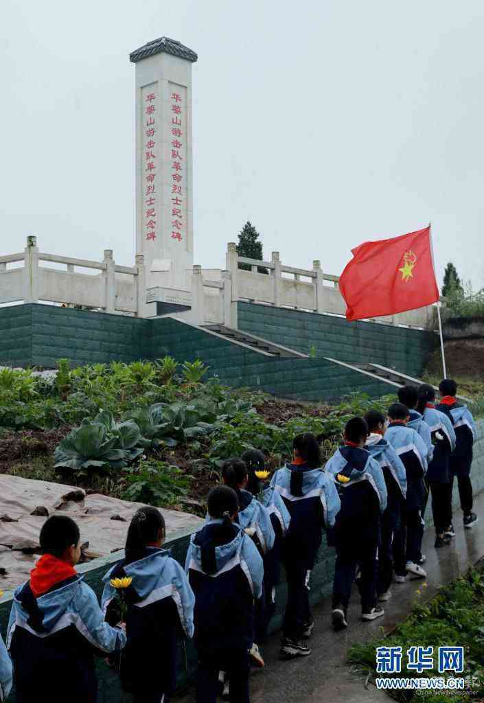 4月1日,华蓥市双河第三小学学生在华蓥山游击队革命烈士纪念碑前开展缅怀先烈活动。新华社发(周松林 摄)