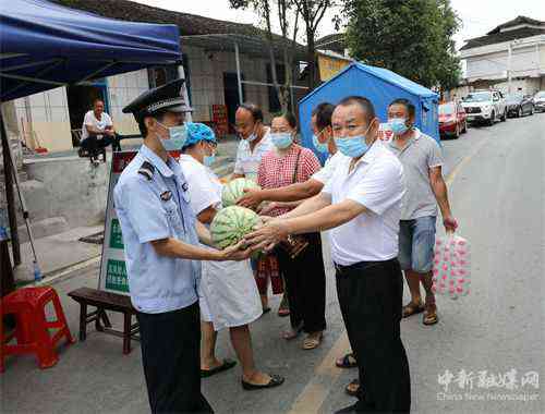 8月10日,湖南省保靖县清水坪学校的志愿者为奋战在防疫第一线的民警、医务等值班人员赠送爱心物资。连日来,该镇不少爱心人士、企业为抗疫一线的民警、医务等值班人员,自发捐赠西瓜、方便面、牛奶、矿泉水等爱心物资,为防控疫情贡献自己的力量。(俞采华 张昌峰)