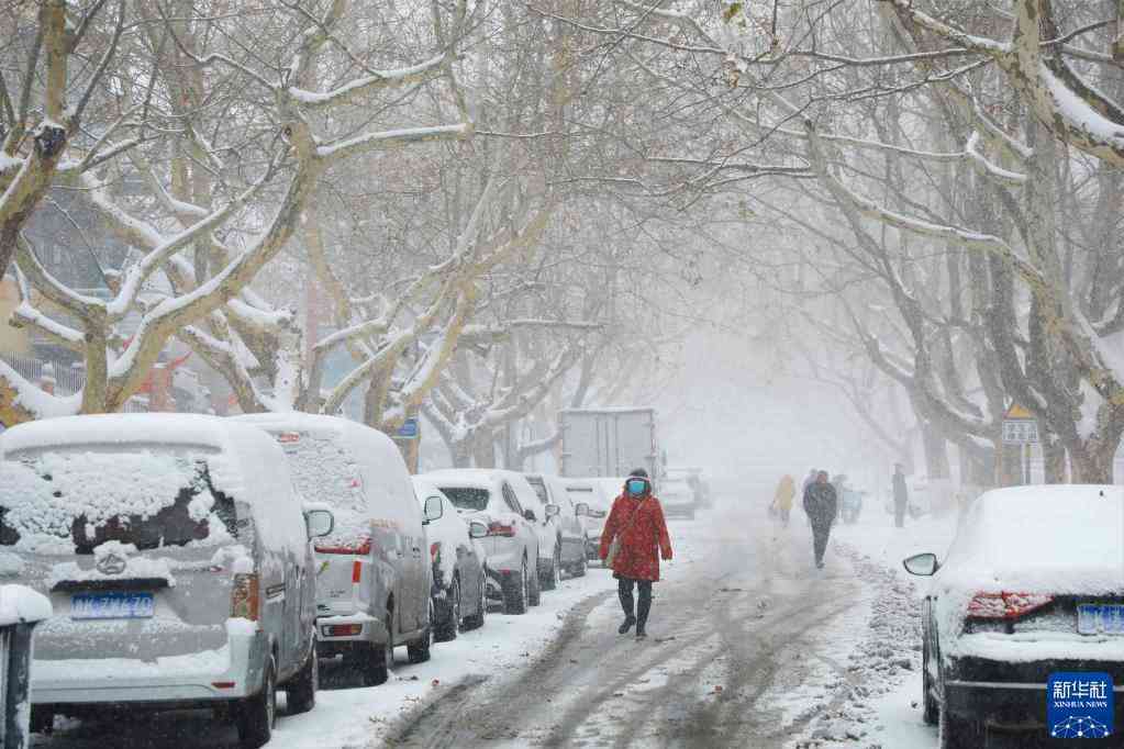 12月17日,在山东省威海市古陌路,市民冒雪出行。
