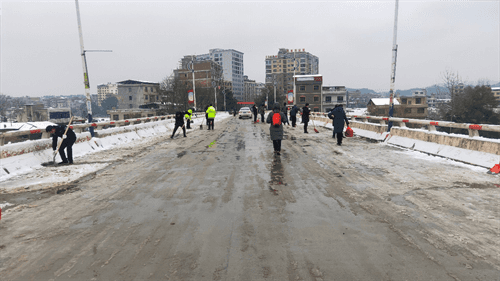 12月27日清晨,在湖南省新宁县回龙寺镇重要交通路段回龙大桥上,只见20多名镇各部门干部在道路上撒盐、铲雪、除冰、设置安全警示牌,全力保障主要路口和桥梁不积水、不冰冻、保畅通。