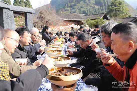 无舞不尽欢,无歌不过年。土家族是一个能歌善舞的民族,他们打溜子、唱三棒鼓、吹唢呐、对山歌,将“调年”气氛推向高潮。“调年”会赶早,年夜饭不夜,热情好客的沙湾人把梨木长桌合拢起来,桌面铺一色青花织锦,然后把杀猪肉、羊肉、豆腐、白菜等各种菜肴端上桌,大家围桌而坐,开心地过上属于他们的节日。
