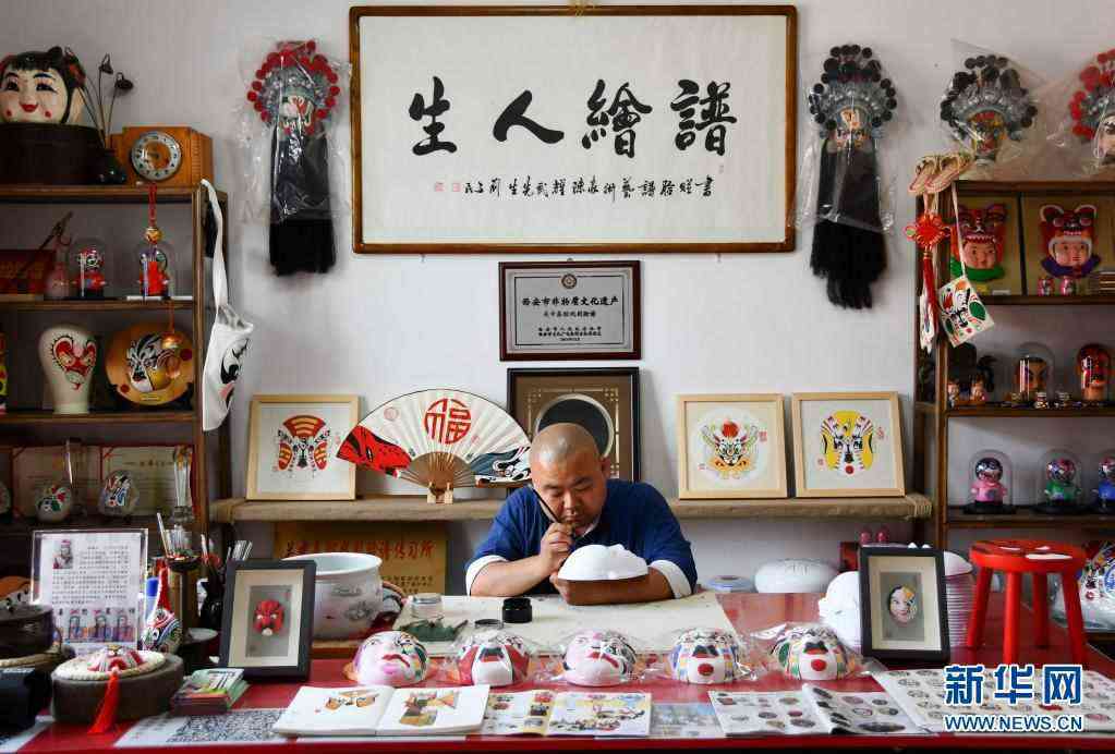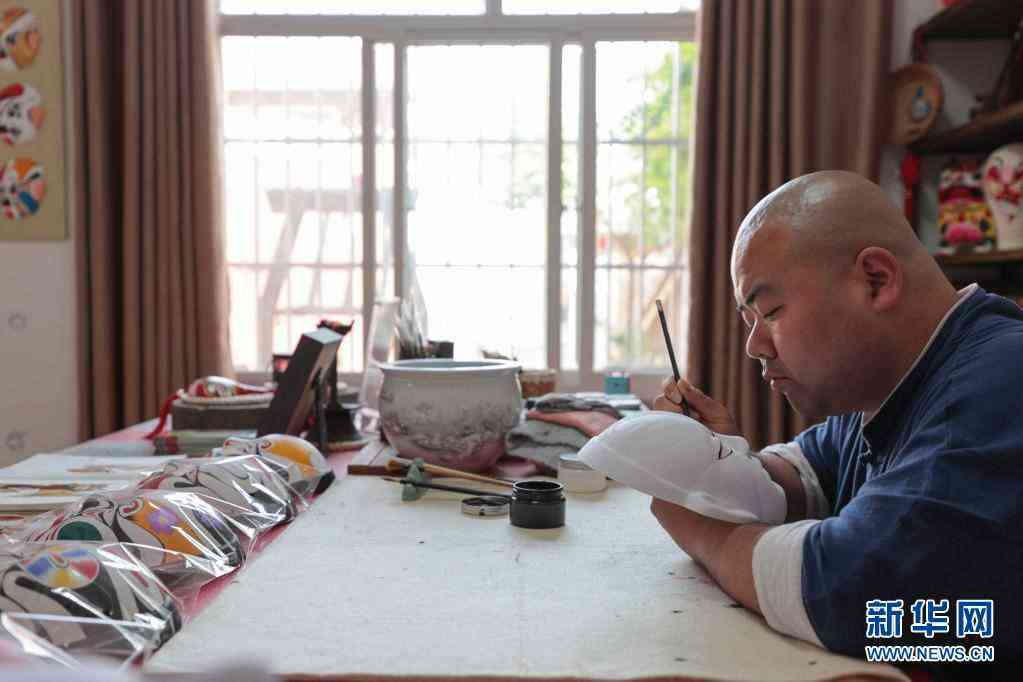 5月7日,脸谱绘画艺人在西安市长安区王莽街道小峪口村的工作室内创作。