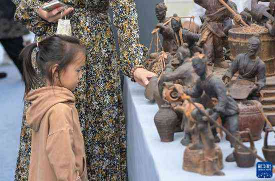 10月15日,一名小女孩在第五届中国非物质文化遗产传统技艺大展上观看淮北泥塑。新华社记者 韩旭 摄