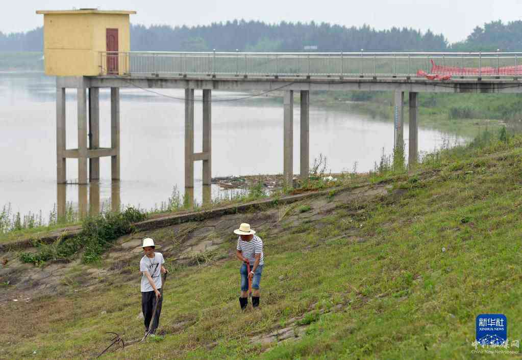 陈申桃(左)和儿子在江西省九江市新港镇东升堤附近处理一起泡泉险情(2020年7月18日摄)。新华社记者 胡晨欢摄