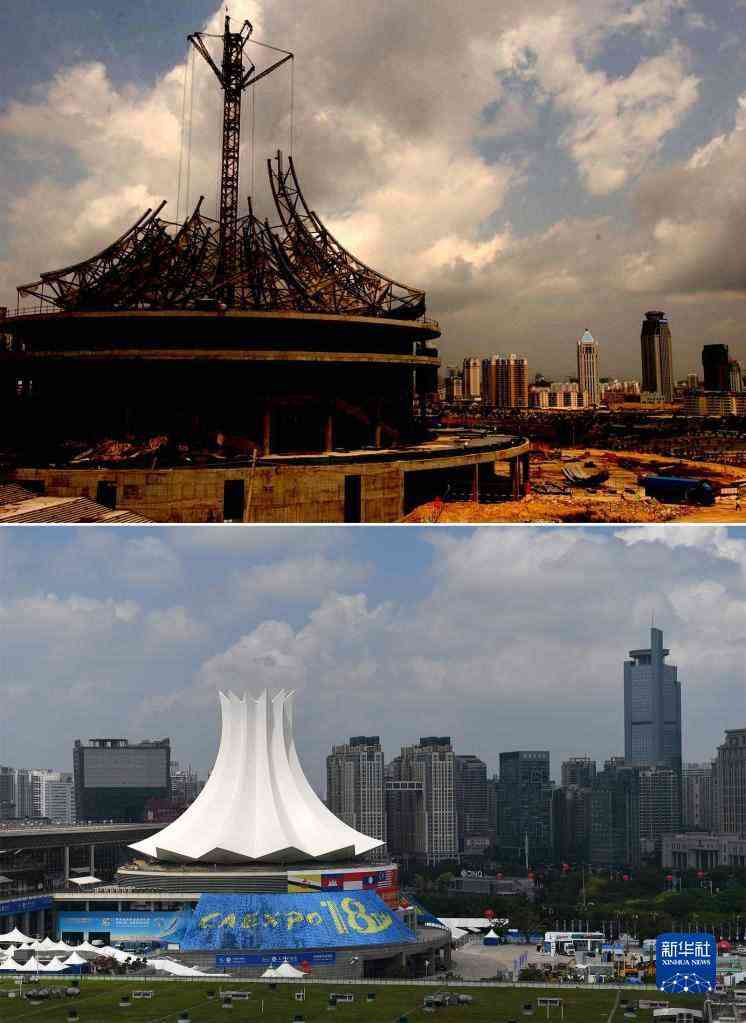 拼版照片:上图为2003年5月7日拍摄的建设中的广西南宁国际会展中心(新华社记者刘广铭摄);下图为2021年9月8日拍摄的南宁国际会展中心(新华社记者陆波岸摄)。