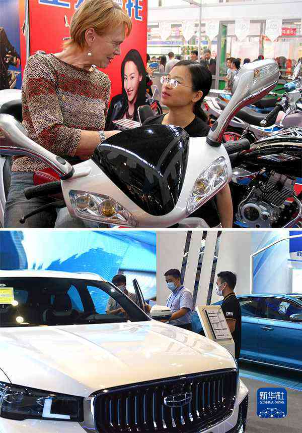 拼版照片:上图为2004年11月5日,在首届中国—东盟博览会上,一名比利时客商在摩托车展台前咨询(新华社记者刘广铭摄);下图为2021年9月12日,在第18届中国—东盟博览会上,参观者在了解吉利汽车性能(新华社记者刘岭逸摄)。 新华社发