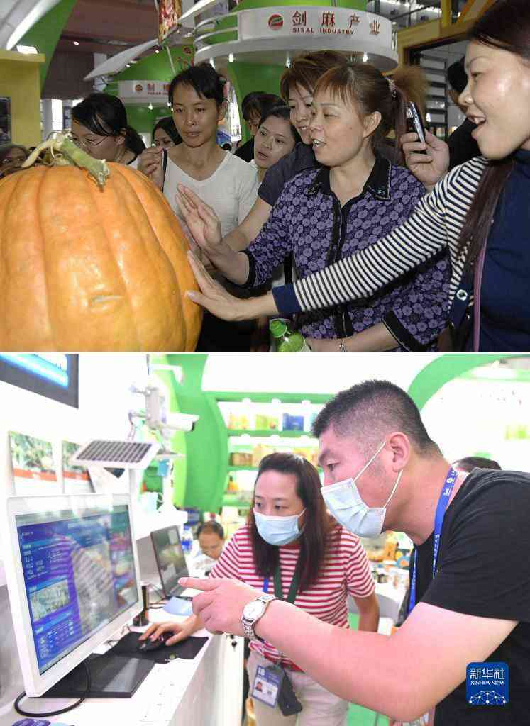 拼版照片:上图为2006年11月3日,在第3届中国—东盟博览会上,参观者在广西农垦展区一个大南瓜前驻足;下图为2021年9月13日,在第18届中国—东盟博览会上,参观者在了解智慧农业监测控制系统运行情况。 新华社记者 周华 摄