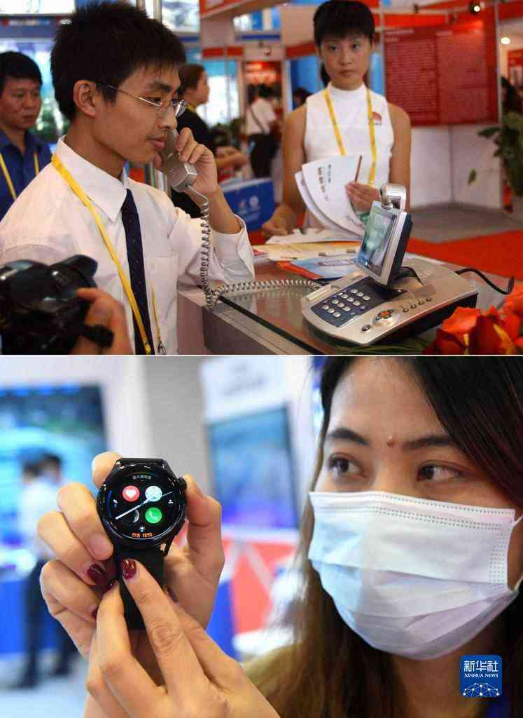 拼版照片:上图为2005年10月19日,在第2届中国—东盟博览会上,一家参展商在展示一款新电话机(新华社记者刘广铭摄);下图为2021年9月12日,在第18届中国—东盟博览会上,一家参展商在展示一款手表电话(新华社记者陆波岸摄)。 新华社发