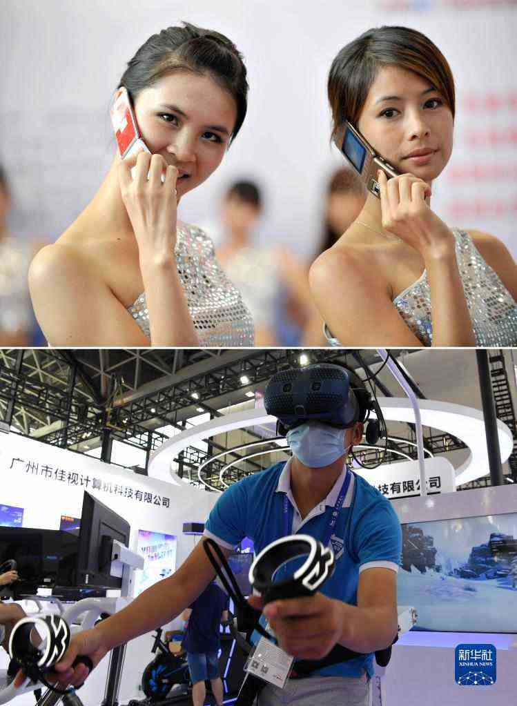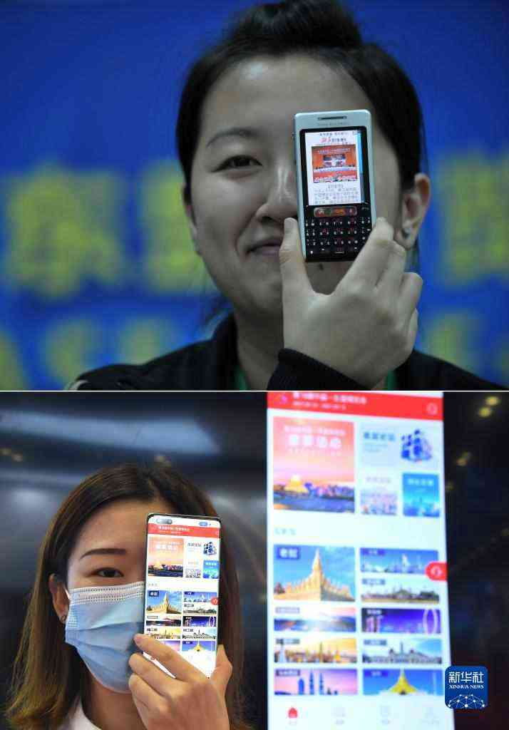 拼版照片:上图为2010年10月22日,在第7届中国—东盟博览会上,两名女士在展示手机新产品(新华社记者周华摄);下图为2021年9月11日,在第18届中国—东盟博览会现场,工作人员在展示VR运动设备(新华社记者马宁摄)。 新华社发