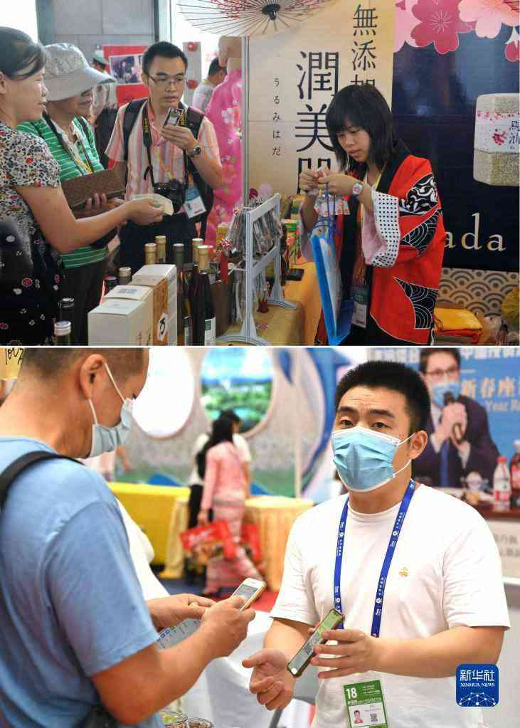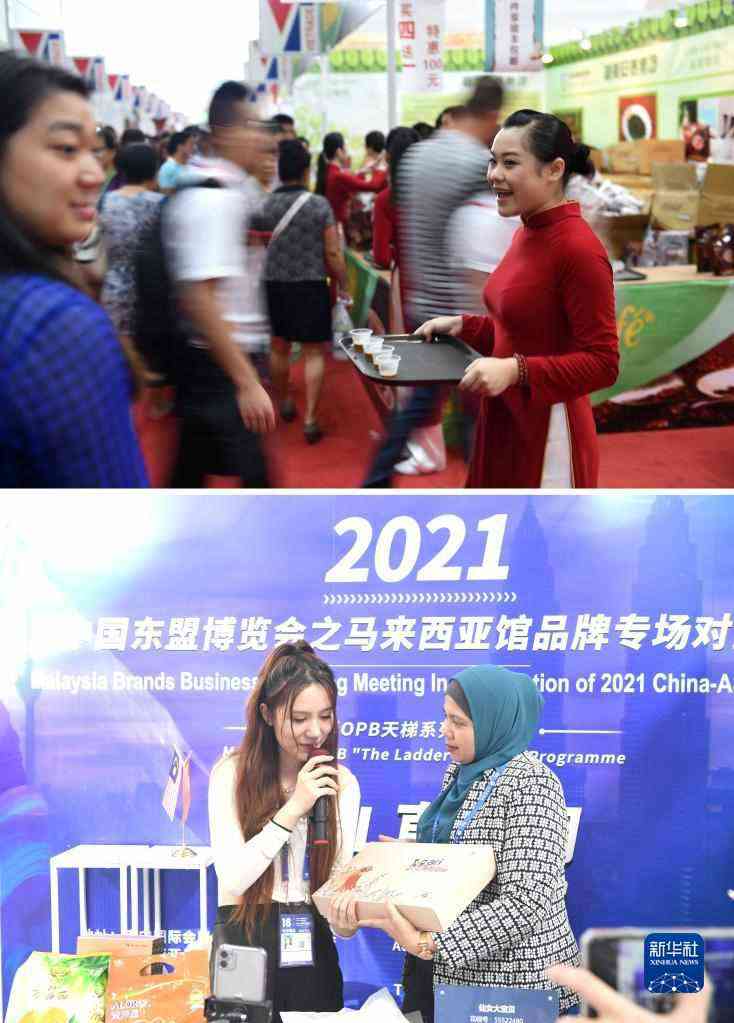 拼版照片:上图为2016年9月12日,在第13届中国—东盟博览会上,观众在选购马来西亚的商品;下图为2021年9月13日,在第18届中国—东盟博览会上,参展商在推介越南食品。 新华社记者陆波岸摄