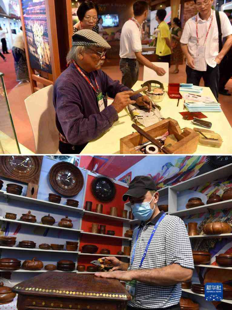 拼版照片:上图为2014年9月17日,在第11届中国—东盟博览会现场,一位泰国工匠在制作首饰(新华社记者张爱林摄);下图为2021年9月11日,在第18届中国—东盟博览会“一带一路”国际展区,来自尼泊尔的阿力在修整参展的木质家具(新华社记者马宁摄)。 新华社发