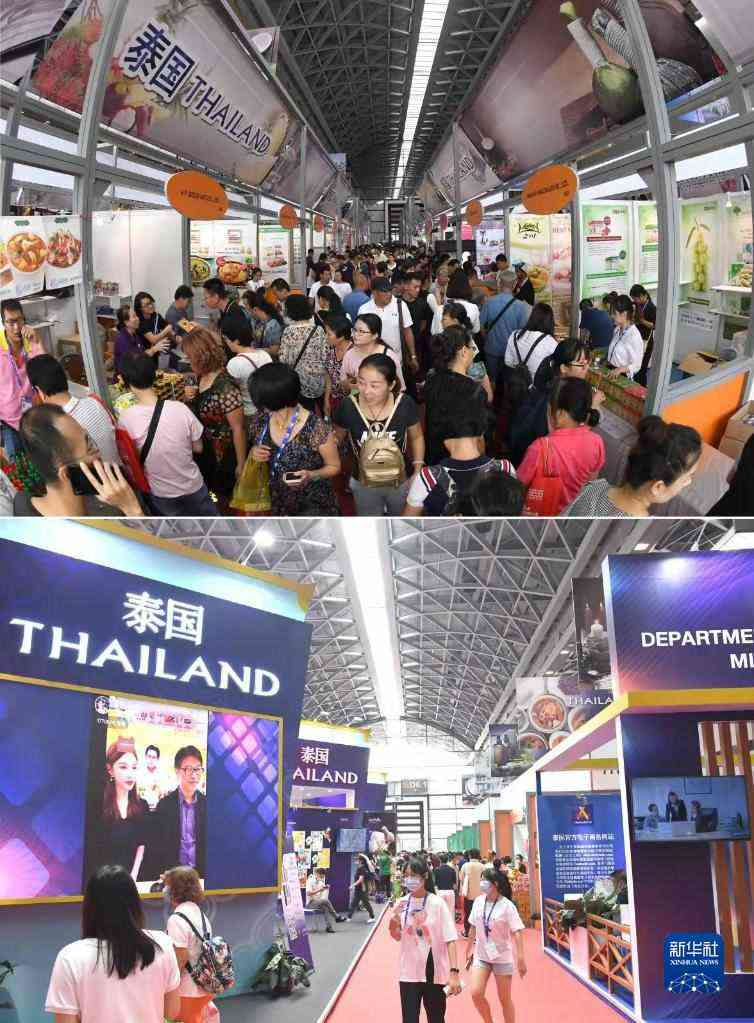 拼版照片:上图为2017年9月15日,在第14届中国—东盟博览会上,参观者在东盟商品馆泰国展区参观;下图为2021年9月13日,在第18届中国—东盟博览会上,参观者在东盟国家展区泰国馆参观。 新华社记者 周华 摄