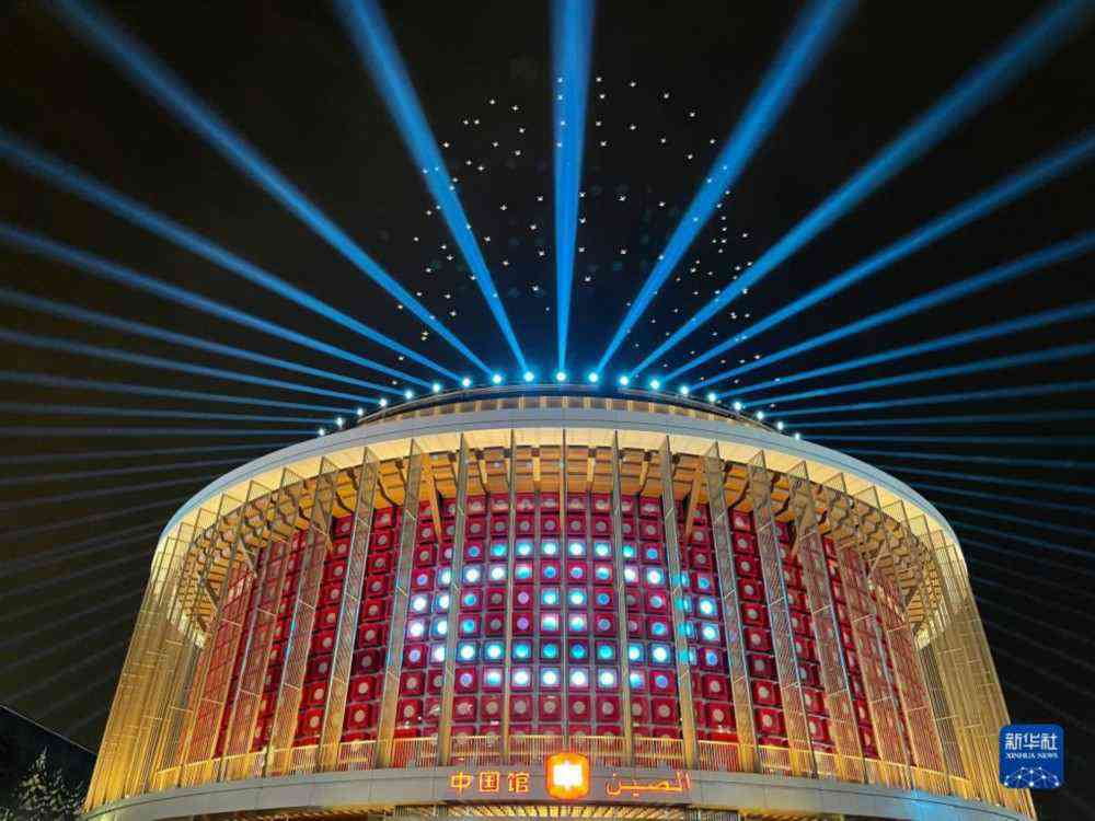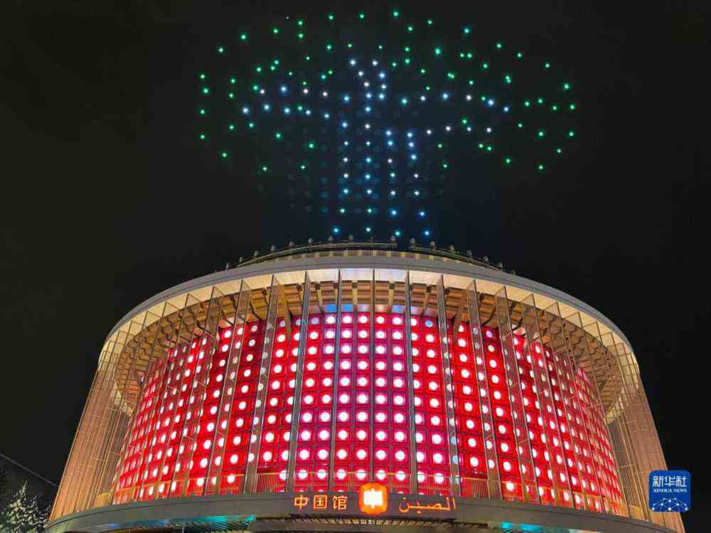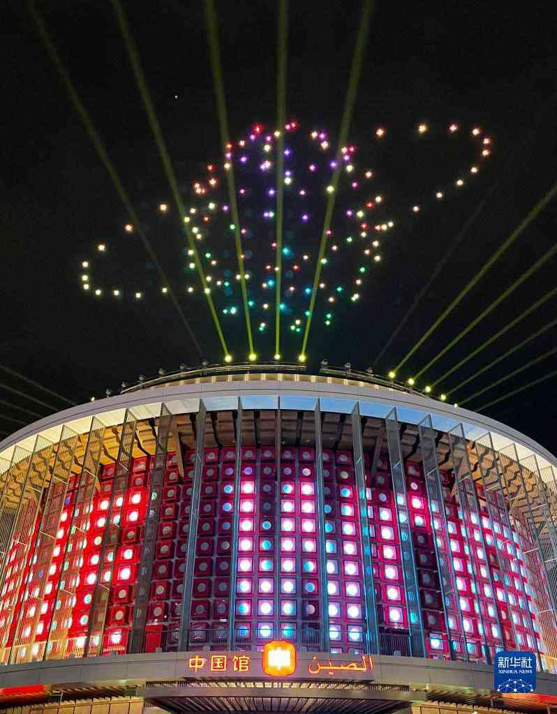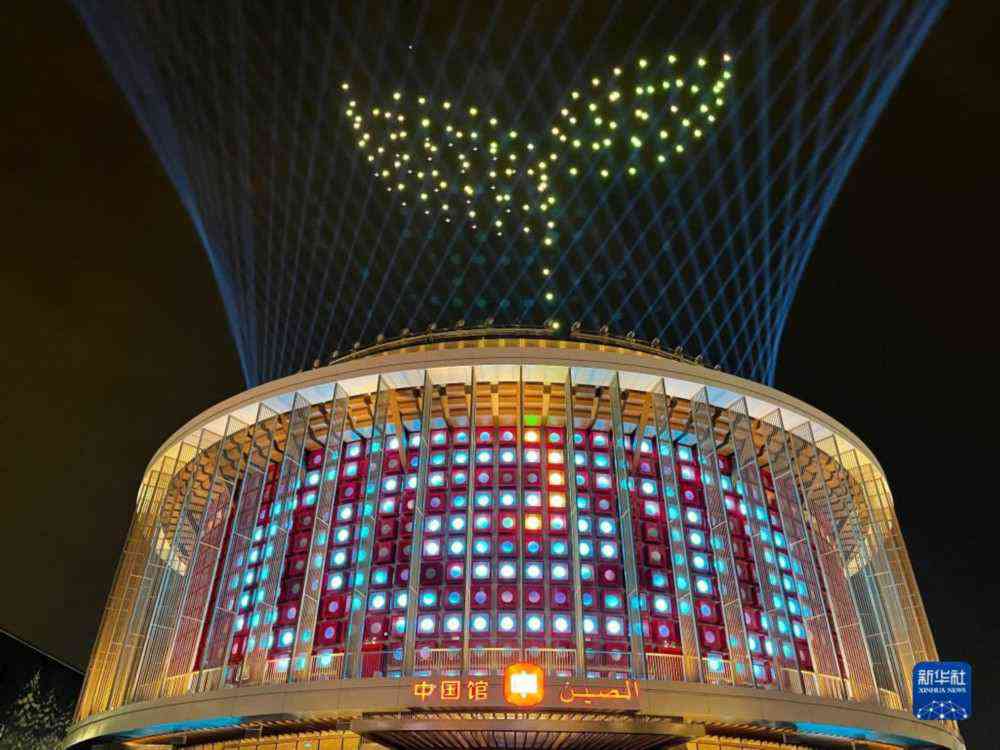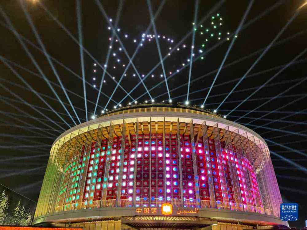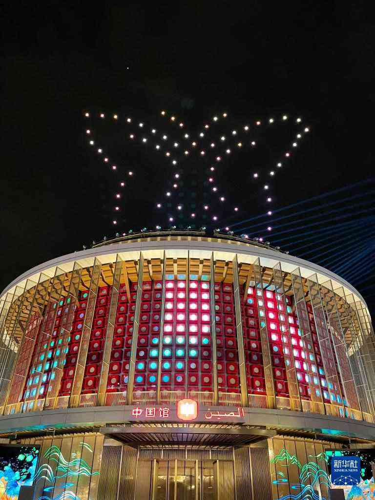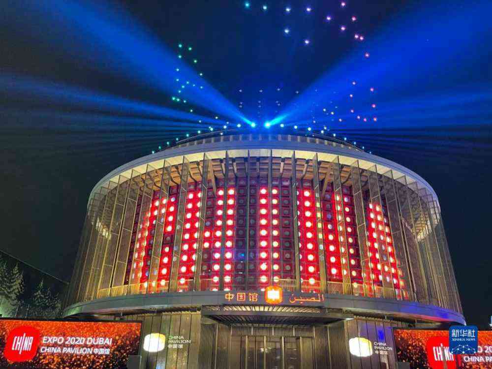 迪拜世博会中国馆自10月1日开馆以来,每晚上演的大型主题灯光秀受到游客的欢迎。灯光秀以“华夏之光”为主题,通过中国馆外墙上1312块LED发光体与150架无人机的矩阵表演相配合,实现大范围的动态视觉效果,为游客献上一场震撼的视听盛宴。