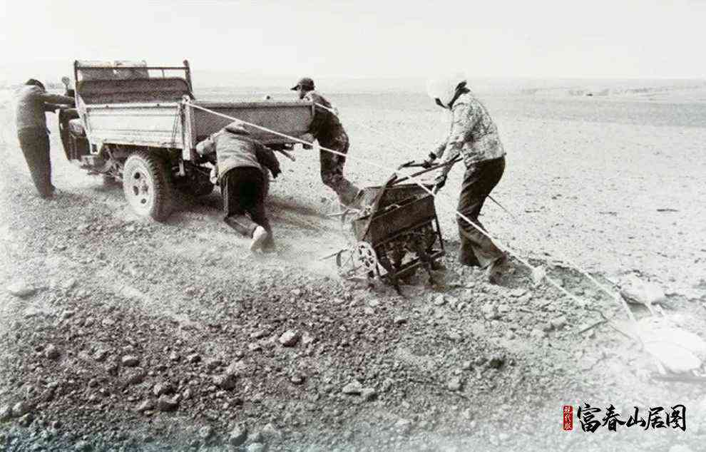 宁夏回族自治区银川市永宁县闽宁镇建设初期,移民群众在戈壁滩上开荒种田。