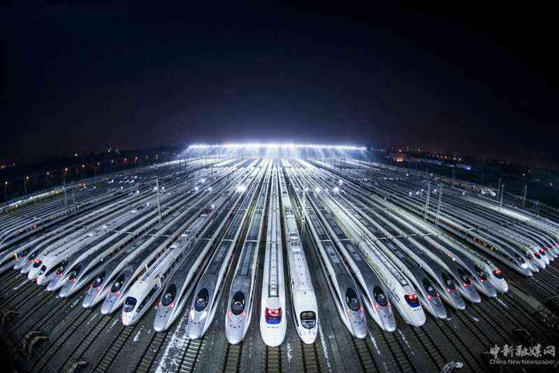 △动车组停靠在武汉动车段的存车线上,准备进行检修和保温作业(2018年2月1日摄)。