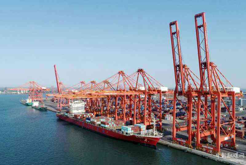△一艘轮船靠泊在唐山港京唐港区集装箱码头装货(无人机照片,2021年4月8日摄)。