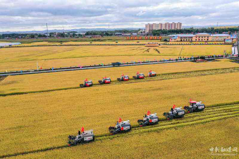 △在吉林省长春市九台区龙嘉街道红光村,农民驾驶农机进行水稻收割作业(无人机照片,2021年9月23日摄)。
