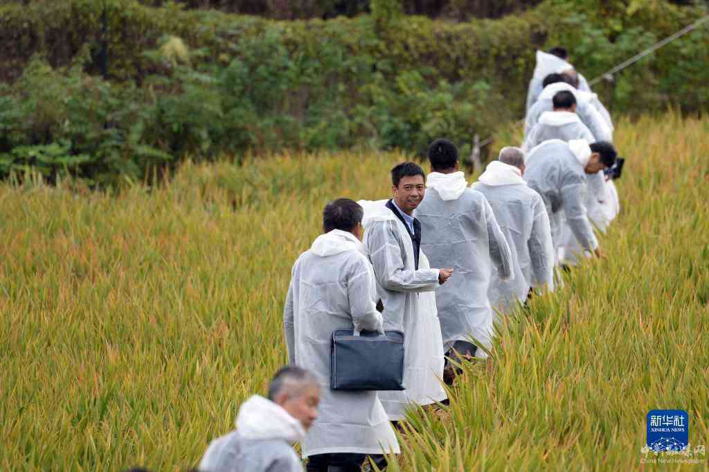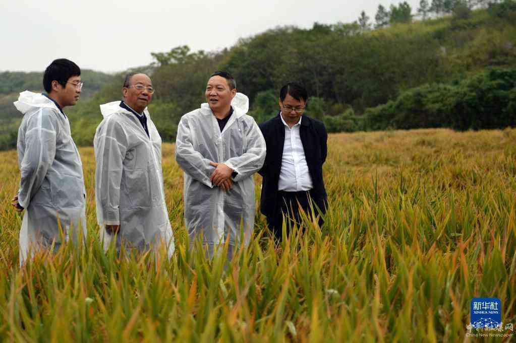10月17日,测产专家组组长、中国科学院院士谢华安(左二)在测产现场查看水稻生长情况。新华社记者 陈振海 摄