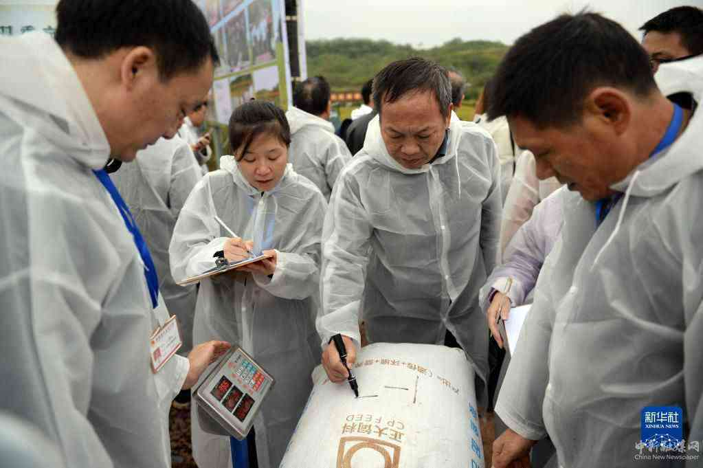 10月17日,测产组工作人员在测产现场将稻谷装袋。新华社记者 陈振海 摄