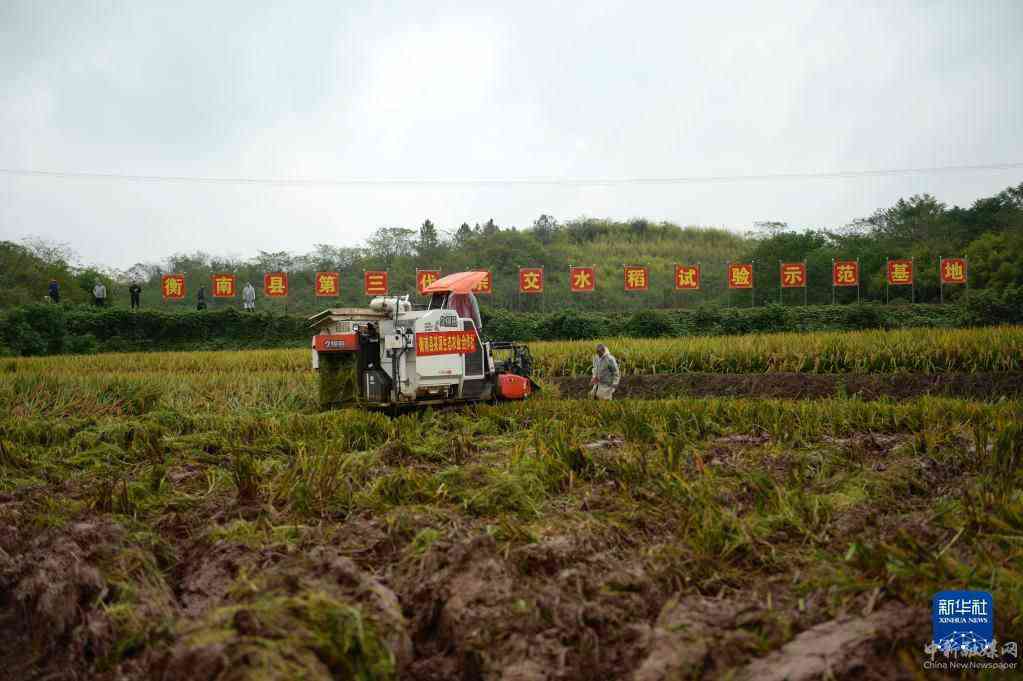 10月17日,工作人员在测产现场进行机械化收割。新华社记者 陈振海 摄